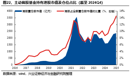2024Q4,主动偏股基金的港股仓位持续提升。截至四季度,主动型基金持有港股重仓股规模为2373.57亿元,较上季度末增加3.02%,港股仓位由12.51%提升至14.51%。