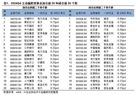 2024年四季度,主动偏股型基金加仓比例前5的个股分别是宁德时代、寒武纪、中芯国际、中兴通讯、美的集团,持股比例较上一季度分别增加0.74pct、0.73pct、0.54pct、0.42pct、0.31pct,宁德时代作为主动偏股基金第一大重仓的地位进一步强化;减仓比例前5的个股为中际旭创、阳光电源、紫金矿业、比亚迪、贵州茅台,持股比例较上一季度分别减少0.89pct、0.77pct、0.58pct、0.36pct、0.32pct。