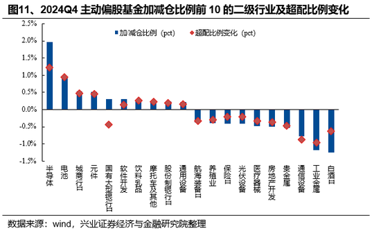 从二级行业仓位变动来看,2024Q4主动偏股型基金加仓较多的二级行业是半导体、电池、城商行、元件、国有大型银行,加仓比例分别为1.96pct、0.97pct、0.53pct、0.51pct、0.31pct。2024Q4主动偏股型基金减仓较多的二级行业是白酒Ⅱ、工业金属、通信设备、贵金属、房地产开发,减仓比例分别为-1.25pct、-1.18pct、-0.78pct、-0.54pct、-0.50pct。