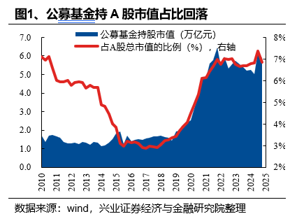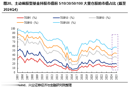 2024年四季度,公募基金持A股市值有所下降,持A股市值占全A总市值比例略有回落。2024Q4,全口径下公募基金持有A股市值下降4.81%至5.89万亿元,公募基金持股市值占比由2024Q3的7.37%下降0.50pct至6.86%。另一方面,公募基金中被动化趋势延续,股票型ETF的持A股市值占比再创新高,持股A股市值近2.9万亿元。