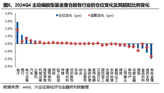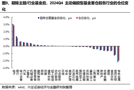 剔除主题/行业基金后,公募仍然大幅加仓电子、银行、电力设备、汽车和计算机,且加仓电子、银行比例更为显著。将新能源/医药/消费/TMT主题或行业基金剔除后,24Q4主动偏股型基金加仓较多的行业是电子、银行、电力设备、汽车、计算机,加仓比例分别为3.03pct、1.36pct、0.63pct、0.54pct、0.50pct,减仓较多的行业是有色金属、医药生物、食品饮料、通信、非银金融,减仓比例分别为-2.18pct、-1.27pct、-0.69pct、-0.69pct、-0.64pct。对比全口径来看,剔除行业/主题基金后,公募对电子、银行、汽车仓位提升幅度更大,对有色金属、医药生物、食品饮料仓位的减持更加显著。