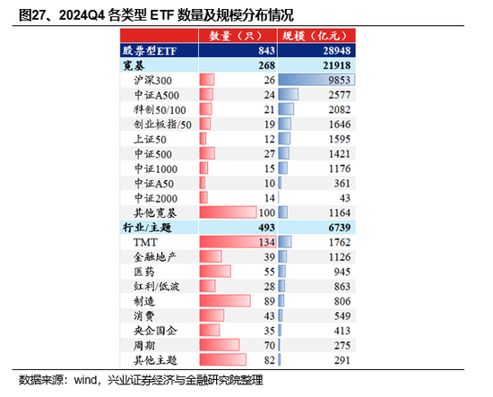 规模分布上,当前股票型ETF仍然聚焦于大市值龙头公司。截至2024年底,宽基ETF规模为21918亿元(占全部股票型ETF规模比例为75.7%),其中沪深300ETF合计规模为9853亿元;中证A500ETF规模快速增长至2577亿元,截至年末已经成为市场内第二大指数ETF;此外,跟踪科创50/100和创业板指/50的ETF产品规模分别为2082亿元和1646亿元。行业/主题ETF规模为6739亿元,其中TMT(1762亿元)、金融地产(1126亿元)和医药(945亿元)板块的ETF规模居前。