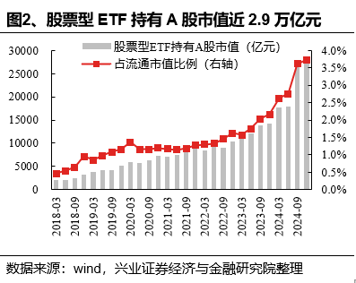 2024年四季度,股票型ETF继续扩容。截至2024年12月31日,境内股票型ETF合计资产净值为2.89万亿元,较2023年底(1.45万亿元)几近翻倍。
