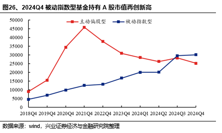 股票型ETF的大规模扩张助推A股市场被动化投资趋势,近年来被动基金持股占比持续提升。2024年四季度被动指数型基金持股规模继续增长,合计达3万亿元。同时,偏股型公募基金(主动偏股型+被动指数型)中,被动指数型基金持股占比达54.48%,较2024Q3提高3.37个百分点。