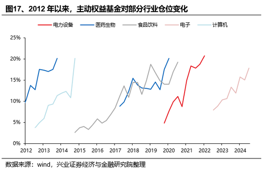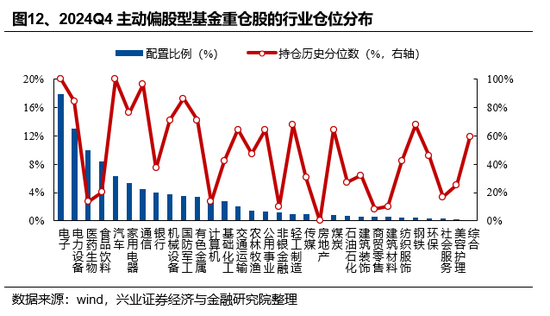 从一级行业超配比例来看,主动偏股型基金超配电子、电力设备、医药生物、家用电器、食品饮料。2024Q4主动股票型基金的重仓股超配前五的行业分别是电子、电力设备、医药生物、家用电器、食品饮料,超配比例分别为8.87%、6.98%、3.69%、3.40%、3.22%。超配比例后五的行业分别是银行、非银金融、石油石化、公用事业、交通运输,低配比例分别是-9.18%、-5.99%、-3.42%、-2.20%、-1.47%。从分位数来看,电子、汽车、钢铁、电力设备、国防军工等的超配比例的历史分位数较高,计算机、非银金融、医药生物、美容护理、食品饮料等处于历史较低水平。