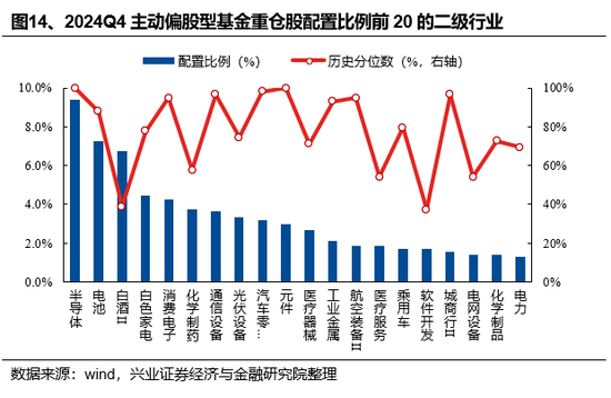 从二级行业超配比例来看,主动偏股型基金主要超配消费和成长板块中的细分行业。具体来看,2024Q4主动股票型基金超配前10的二级行业分别是半导体、电池、白色家电、白酒Ⅱ、通信设备、消费电子、元件、光伏设备、化学制药、医疗器械,超配比例分别为5.12%、4.80%、3.22%、3.19%、2.29%、2.23%、2.09%、1.97%、1.70%、1.32%。