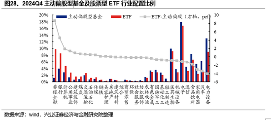 行业配置上,股票型ETF集中在新质生产力和大金融板块。截至2024Q4,股票型ETF前五大持仓行业分别为电子(16.77%)、非银金融(9.82%)、医药生物(9.13%)、电力设备(8.97%)和银行(8.49%)。相对主动偏股型基金,股票型ETF超配非银金融(8.65pct)、银行(4.52pct)、计算机(1.88pct)、公用事业(1.40pct)和建筑装饰(0.94pct)等行业,在电力设备(-4.04pct)、汽车(-3.37pct)、家用电器(-3.02pct)、食品饮料(-1.73pct)和有通信(-1.23pct)等行业低配。